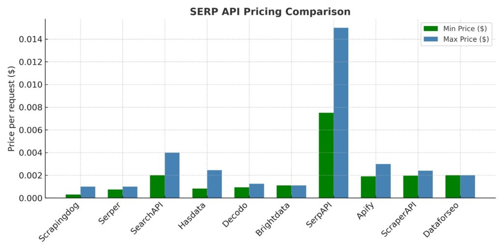 Scrapingdog offers the lowest effective pricing, dropping to $0.00029 per request at scale, far cheaper than competitors like SerpAPI ($0.015) or Apify ($0.003). Most other providers range between $0.0008 and $0.002 per request.