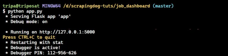 This configuration allows the Flask application to send job data to the dashboard.html template, where it is presented as a well-organized and styled HTML page for the user to see. Now you can proceed to run your Flask application. You can execute the following command: