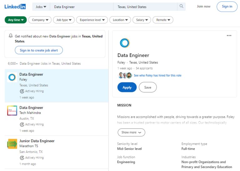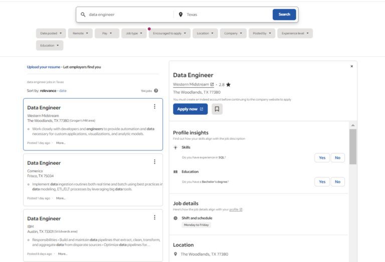 Let’s proceed to the job search page to find all available data engineer positions in Texas.