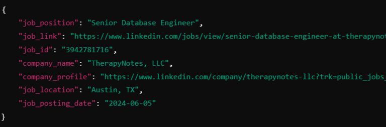 Once the code runs successfully, you will receive the parsed JSON data from the LinkedIn jobs page. A new file named “linkedin_jobs.json” will be created in the “data” directory.