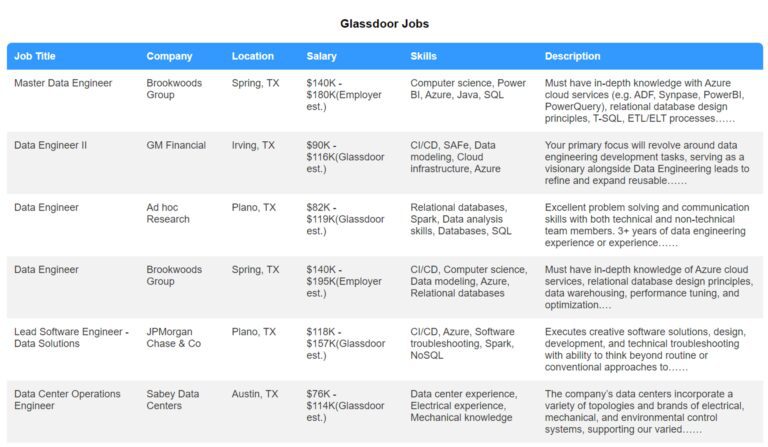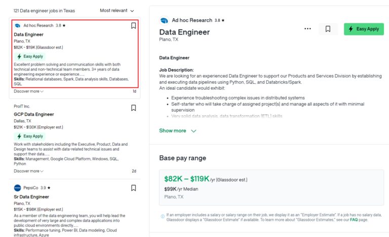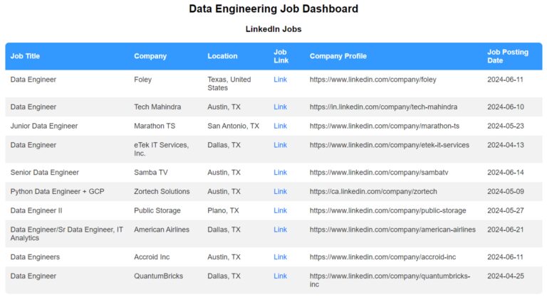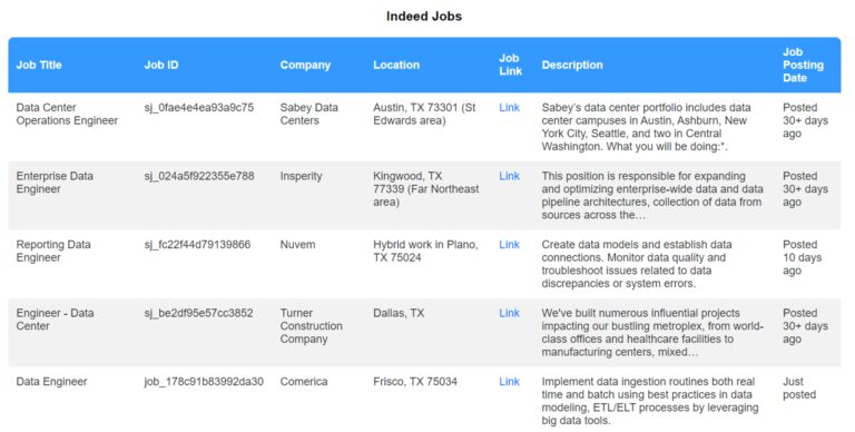 For this tutorial, we’ll extract data engineer jobs from LinkedIn, Glassdoor, and Indeed in the Texas region. We’ll then display these jobs on our dashboard, including essential details like title, company, location, salary, job description, and application link.
