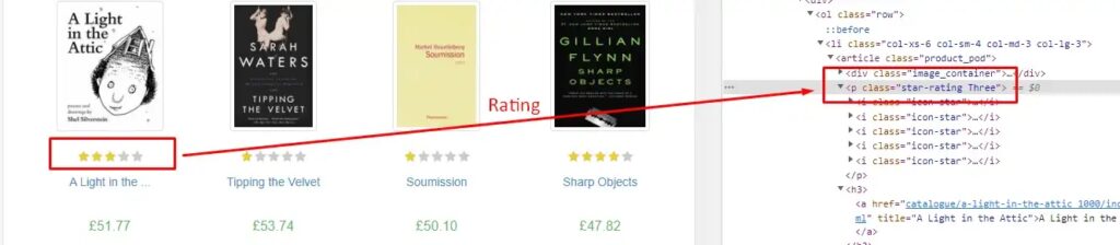 Rating is stored under the class attribute of tag p. We will use .get() method to extract this data.