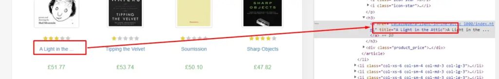 The name of the book is stored inside the title attribute under the h3 tag.