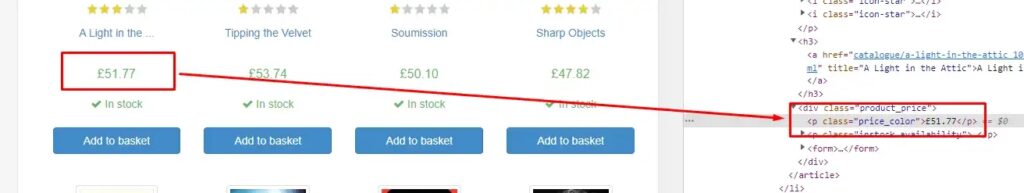 Similarly, you can find the price data stored inside the p tag of class price_color.