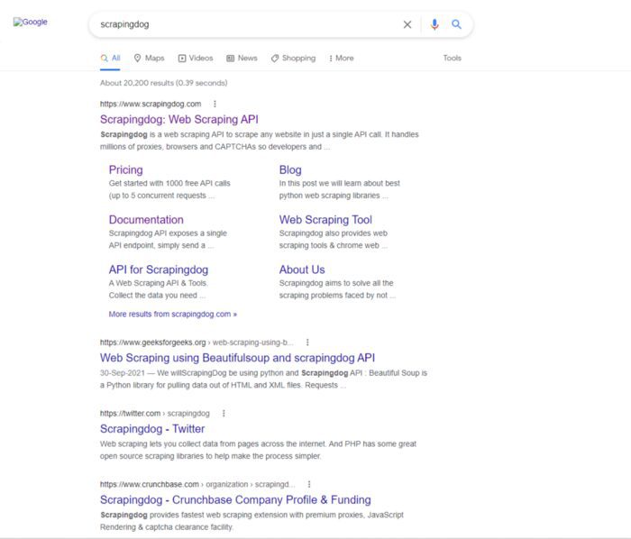 For this example, we will scrape Google. We will type a query on the input field and then press enter. After that whatever results appear on our screen we will scrape it.
