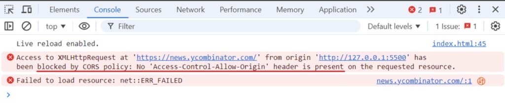 The output indicates that our code won’t work due to a “No ‘Access-Control-Allow-Origin‘ header is present on the requested resource” error, which is related to Cross-Origin Resource Sharing (CORS).