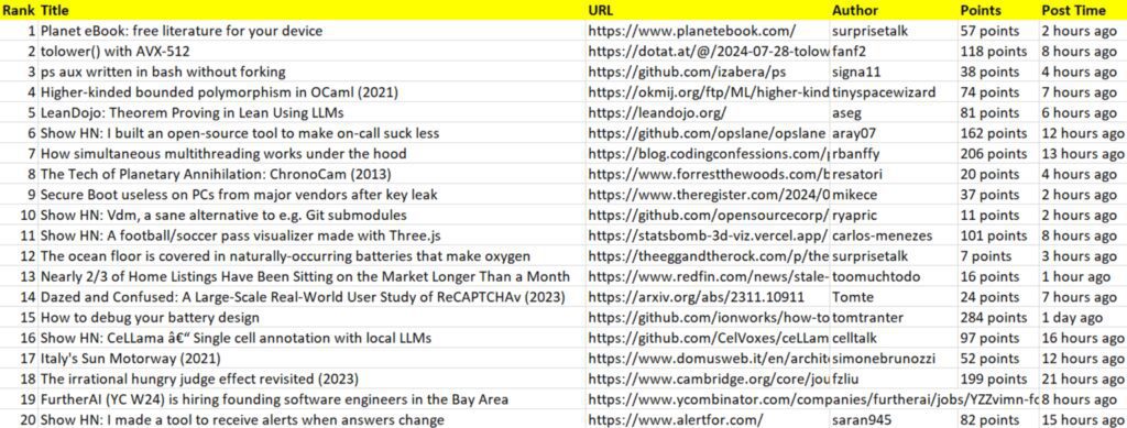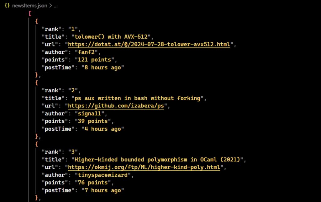 Nice! We’ve successfully extracted all the desired data from the first page of Hacker News. However, this is not enough, as we need to fetch data from multiple pages. Let’s explore how to scrape multiple pages by handling pagination.