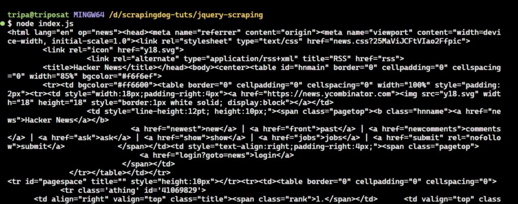 Let’s write a Node.js script that uses the jsdom library to create a simulated browser environment and the jquery library to perform an HTTP GET request to fetch the HTML content of the Hacker News: