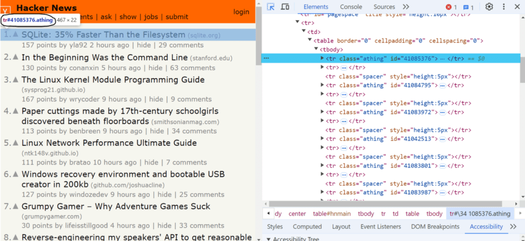 The .find() and .children() methods are similar, but .children() only select elements that are direct children of the original set. As shown in the image below, the CSS selector for identifying news elements is tr.athing. You can use the .find() method to retrieve a list of these HTML elements.