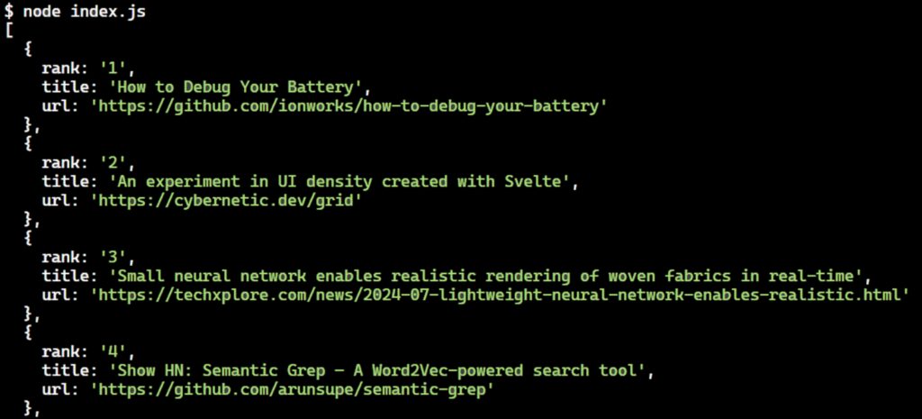 Next, we iterate over each news item element to individually extract its rank, title, and URL. We use jQuery’s .each() method to process these elements one by one.