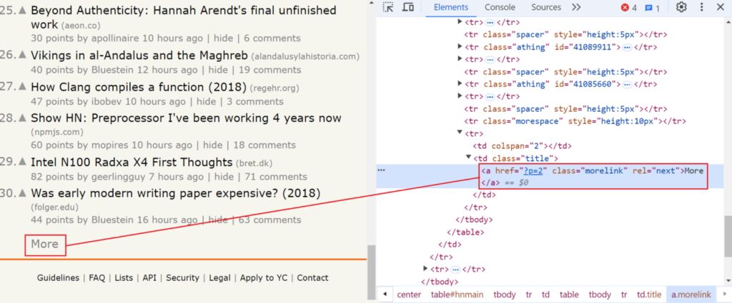 Finally, we find the element containing the title and URL of the news item. This is an anchor (<a>) element within a span with the class “titleline”. We extract the text of the title directly from the anchor and the URL from its href attribute.