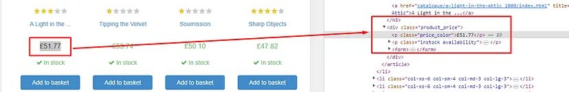 The price is stored inside the p tag with class price_color. So, we have to create a pattern that starts with <p class=”price_color”> and ends with </p>.
