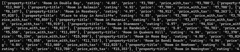 target_url="https://api.scrapingdog.com/scrape?api_key=YOUR-API-KEY&url=https://www.airbnb.co.in/s/Sydney--Australia/homes?adults=1&checkin=2024-05-17&checkout=2024-05-18&wait=3000"