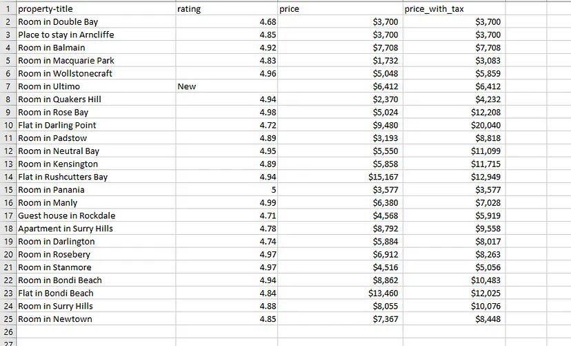 Selenium, parse withBeautifulSoup. - Extract property title, rating, price, and price with tax; export to