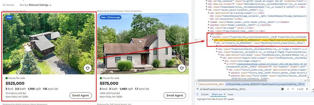 Now on every page, there are a total of 24 properties and to get data from each of these properties we have to run a for loop. But before that, we have to find the location where all these property boxes are located.