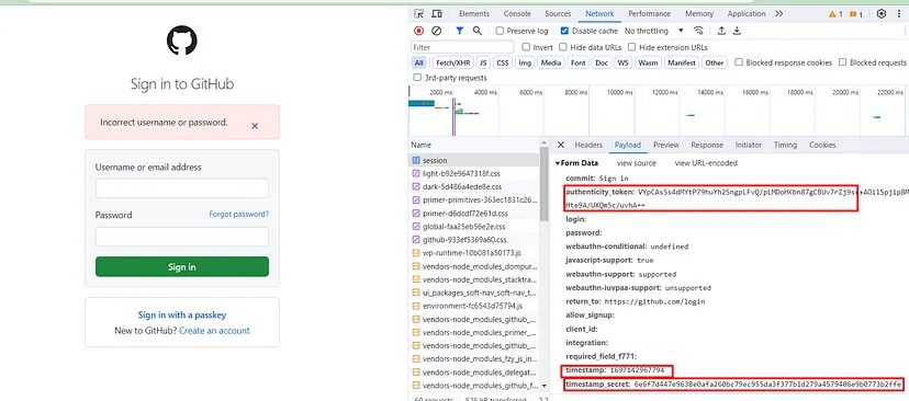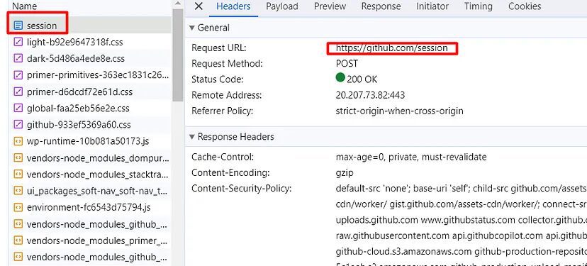 This proves that GitHub uses csrf token for login. Now, let’s see what happens in the Network tab when you click Sign in button(keep the username and password box empty). You will definitely see a POST request to this /session endpoint. This is our target endpoint.