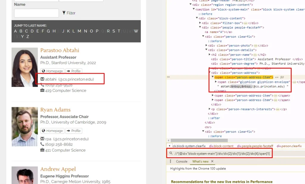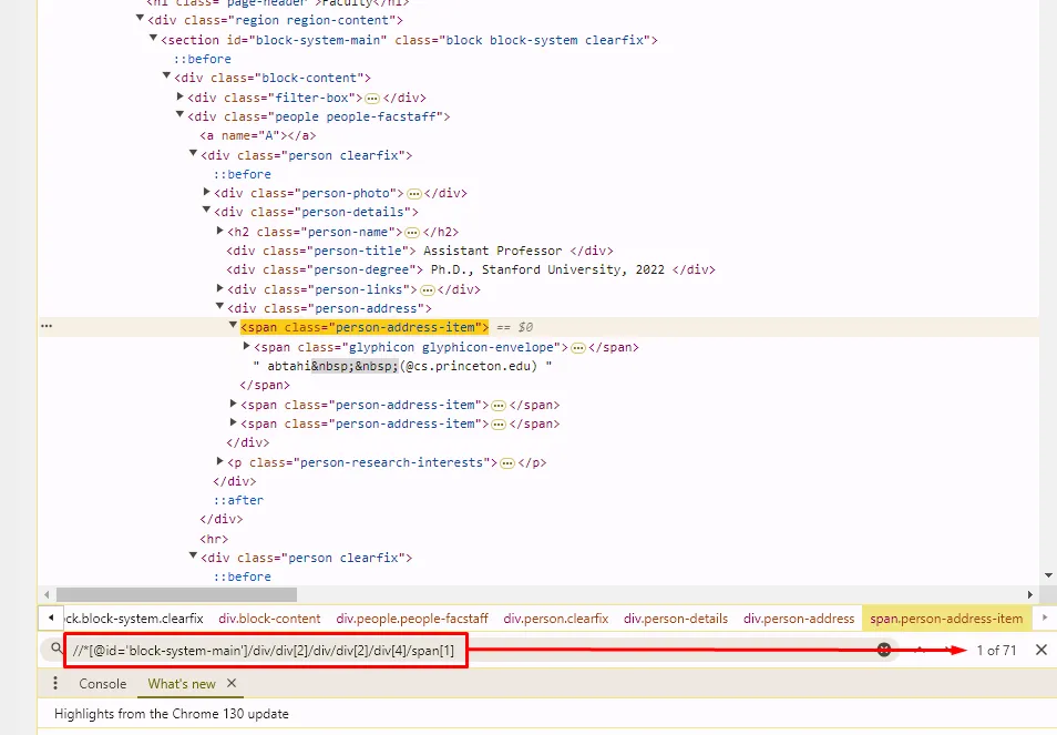 Above XPath can select the first email only. I need the emails of all the faculty members. So for that, I would have to find an XPath that can select all the emails at once.
