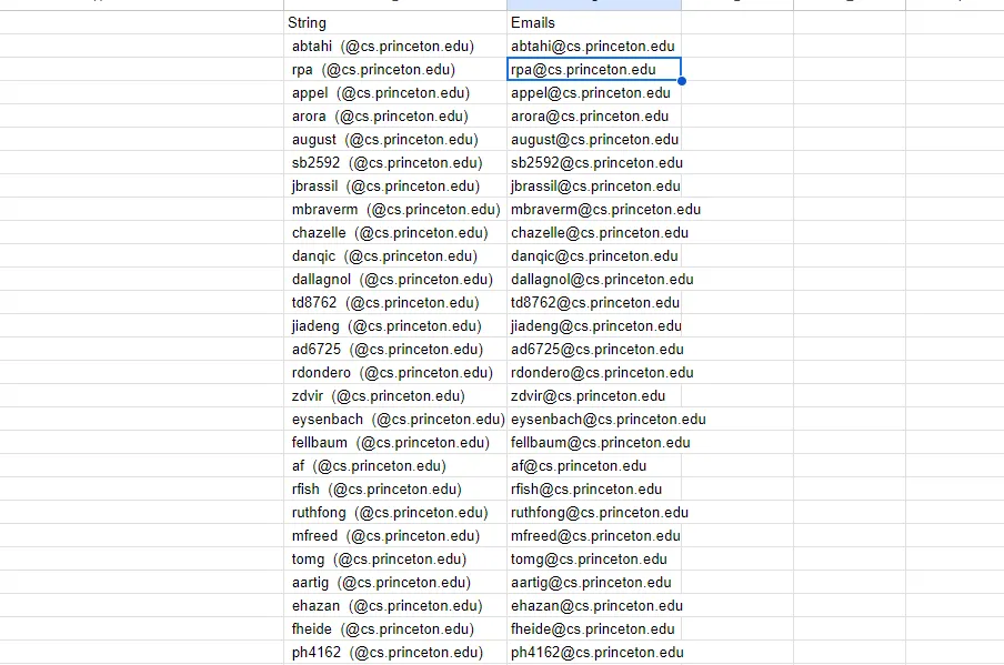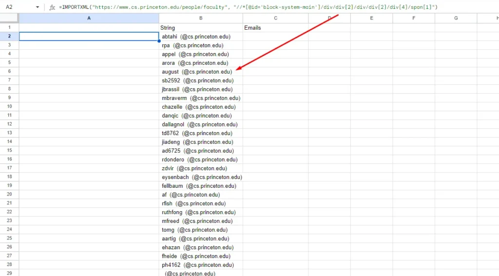 In this example, I will scrape the emails of faculty members of Princeton University. We will use built-in functions like IMPORTHTML and IMPORTXML of Google Sheets to scrape and parse the results. I would recommend you to read web scraping with Google Sheets before proceeding with this section.