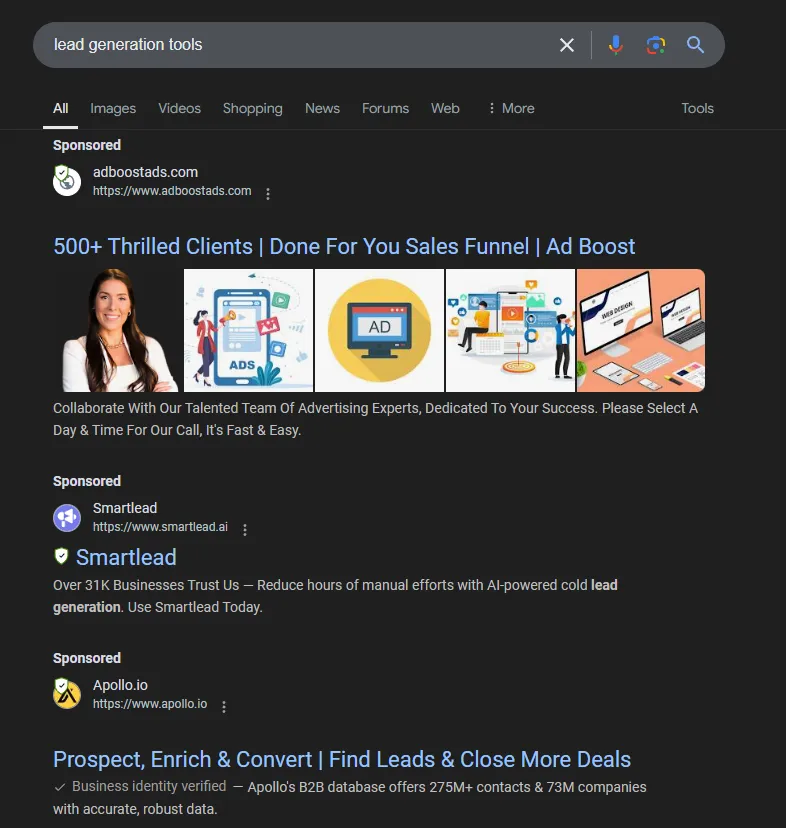 Imagine, you’re a digital marketer of a lead generation company researching for the competition for the keyword “lead generation tools”. You search for this query on Google and find out the space was already occupied by some top companies in your business domain.