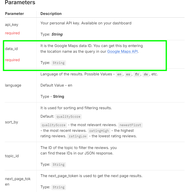 If you look at the Google Maps API documentation, you’ll notice that it requires two mandatory arguments in addition to your secret API key- coordinates and a query. (see the image below)