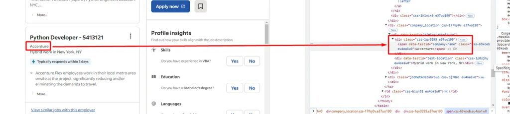The name of the company can be found under the span tag with attribute data-testid and value company-name. Let’s extract this too.
