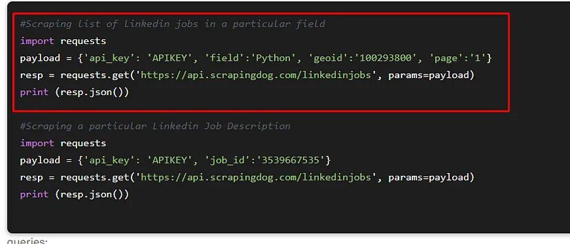 But before that, in “http://api.scrapingdog.com/linkedinjobs?page=1&geoid=101473624&field=python&api_key=Your-API-Key”, see the last part “Your-API-Key”, here you have to paste your own API key.