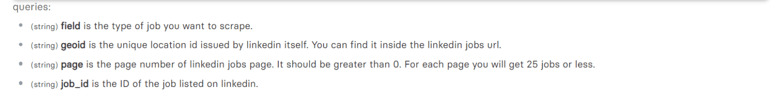 Now, we can start scraping. I would request you go through the documentation of LinkedIn Jobs API. This will give you an