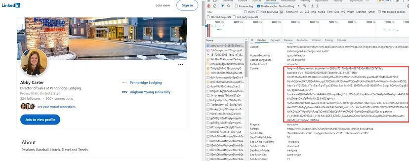 Let’s first collect cookies by opening a public profile. You can get cookies by opening the Chrome dev tools.