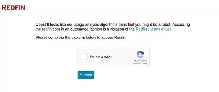 The above approach is fine until you are scraping a few hundred pages but this approach will fall flat when your scraping demands reach millions. Redfin will start throwing captcha pages like this.