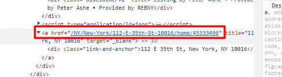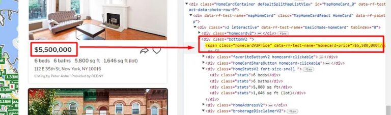 allBoxes is a list that contains all the property data elements. Using for loop we are going to reach every property container and extract the details. But before we write our for loop let’s find the DOM location of each data point.