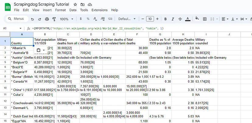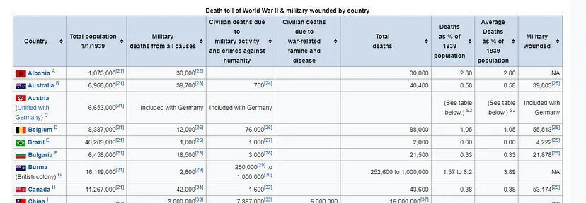 =IMPORTHTML("https://en.wikipedia.org/wiki/World_War_II_casualties", "table", 1)