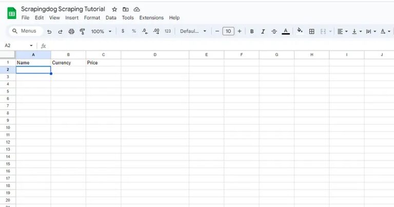 First, we will create three columns Name, Currency, and Price in our Google Sheet.