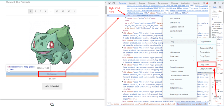 I know you must be wondering how you will get this xpath_query, well that is super simple. We will take advantage of Chrome developer tools in this case. Right-click on the name of the first Pokemon and then click on Inspect to open Chrome Dev Tools.