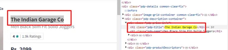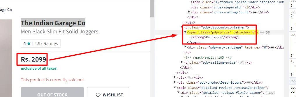 Similarly, you can see that the pricing text is located inside the span tag with class pdp-price.