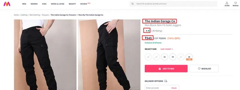 Myntra product pages contain structured data like product name, price, ratings, reviews, and availability.