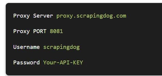 If you sign up to Scrapingdog you will find an API Key on your dashboard. That API Key will be used as a password for the proxy. You can consider reading the docs before using the proxy but the usage is pretty straightforward.