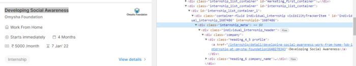 We are interested in what internships we have. We will scrape every individual internship provided. If you will inspect the page you will find that internship_meta is our target tag.