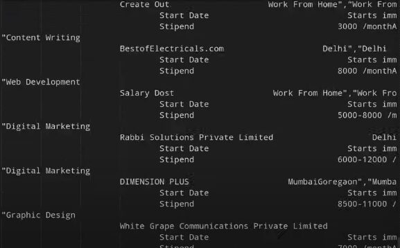 We have created a pointer to that HTML element and it is pointing to internship_meta tag. Using the above code we are going to write the data into our CSV file. writer function will type the slice of a string.
