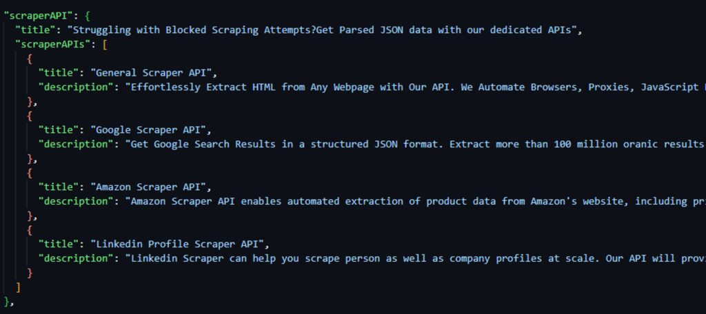 You can expand the above logic to extract the desired data from a webpage. First, let’s see how to scrape all dedicated scraper APIs for web scraping.
