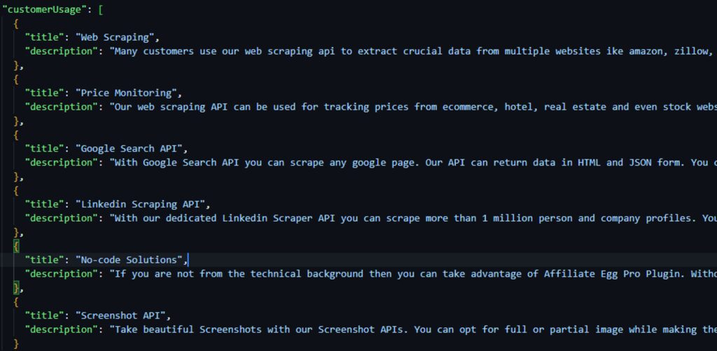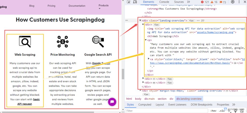 Similarly, you can extract the data on how customers use Scrapingdog. For this, you have to extract data from each < div> element within the class landing-overview. Then iterate through each < div> and retrieve the title from the < h3> tag and the description from the < p> tag.