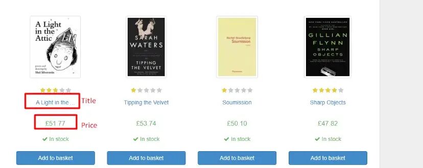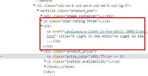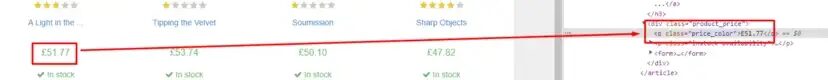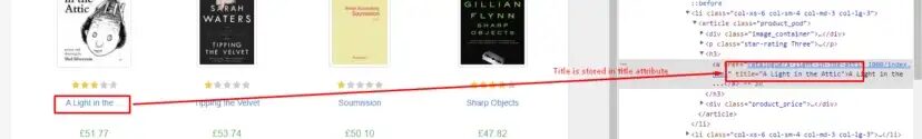 As you can see in the above book title is stored inside the title attribute of a the tag. Now let’s see where is the price stored.