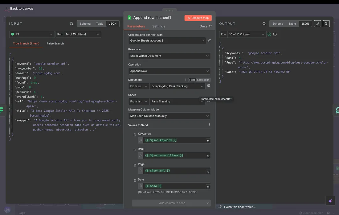 The final step is to append rows in our Spreadsheet, assuming the kw was found on Page 1.