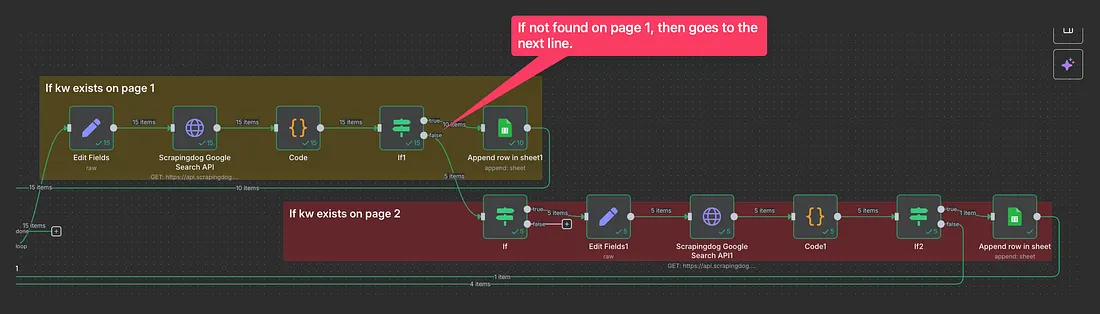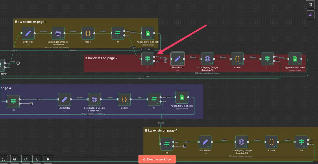 Essentially, what is happening here is, the workflow takes one keyword from our flow, determines if it ranks on page 1, and if not, then transfers it to page 2.