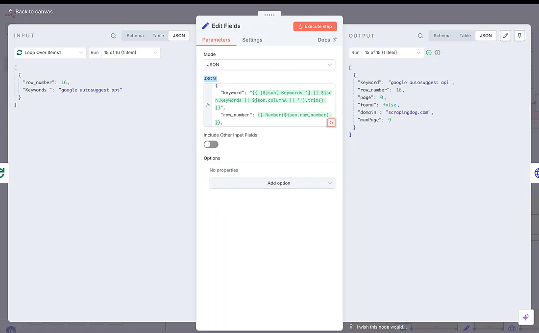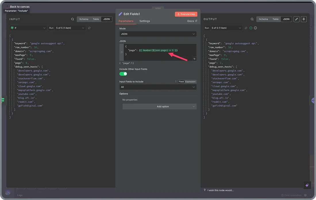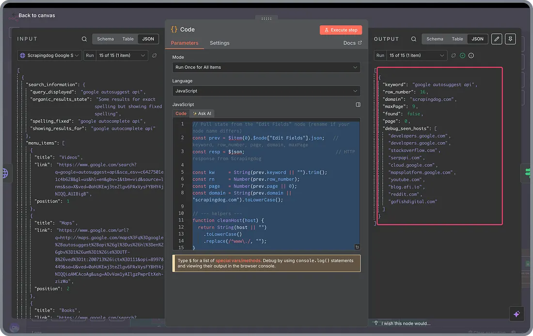 Now, after scraping the 1st page result, logically we need to find if any of our domain’s links exist on page 1, and for that we will use a JavaScript code in the “Code” node.