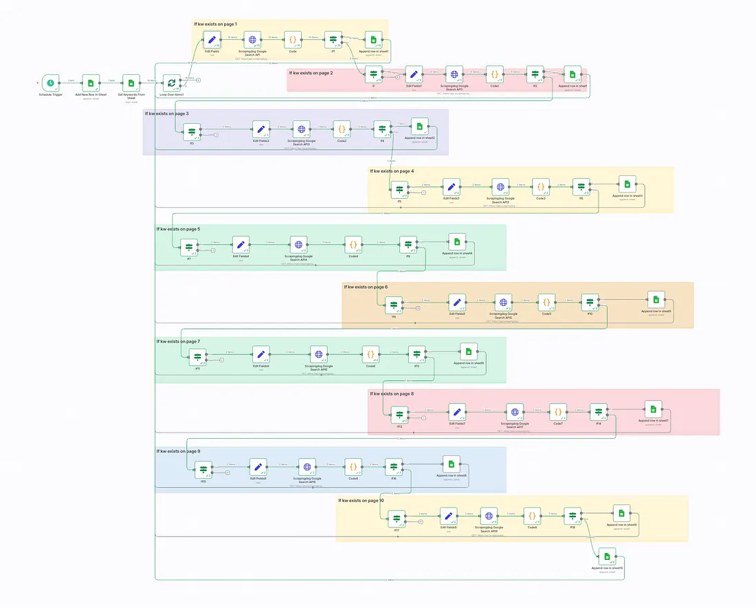 The Idea was to create a basic rank tracker that is optimized for cost as well as efficiency. We are not scraping all 10 pages upfront, i.e., if the keyword is found on page 1, the workflow automatically takes the second keyword and gets results for the next keyword.