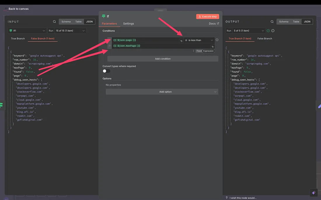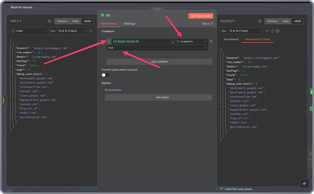 And therefore, in the next node, we determine if the “found” data point is true or not. If it is, we take the data into Google Sheets; if it is false, we get results for the next page & repeat the same process.