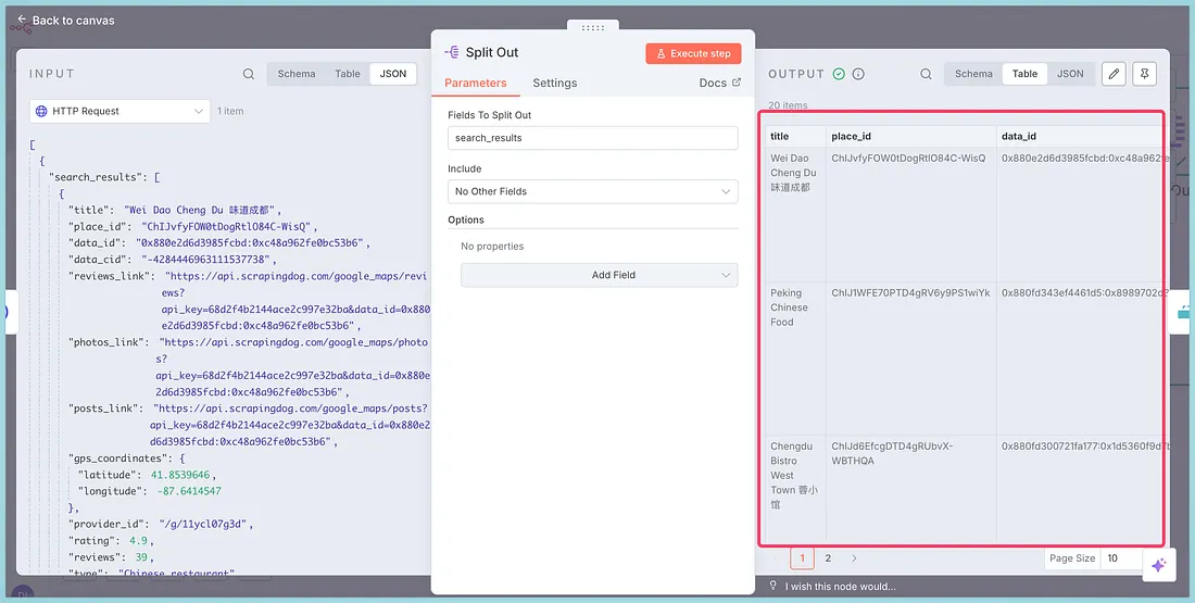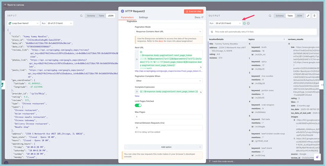 The loop node next, as you can see in our workflow, helps us to take businesses’ data_id one by one & pass them to our Google Maps reviews API.